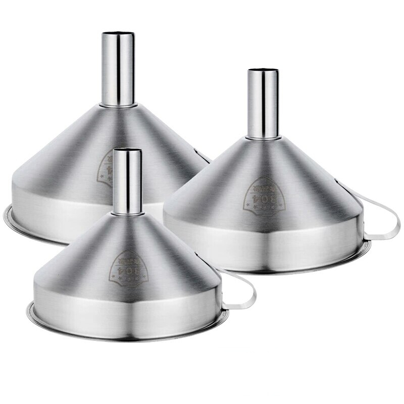 Entonnoir de cuisine avec une poignée, en acier inoxydable et filtre amovible, pour transférer toutes sortes de liquides et les filtrés en même temps. Existe en plusieurs tailles.